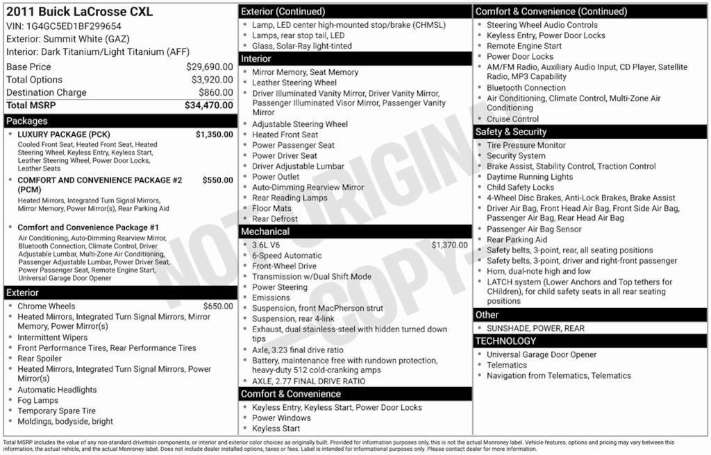 Summit White 2011 Buick LaCrosse CXL 3.6L V6 DGI DOHC VVT. 17/27 City/Highway MPG