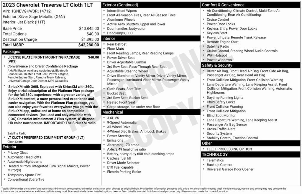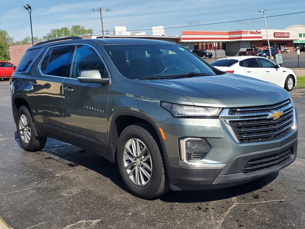 New Price! Silver Sage Metallic 2023 Chevrolet Traverse LT AWD, 2-Way Manual Front Passenger Seat Adjuster, 3.49 Axle Ratio, 3rd row seats: split-bench, 4-Wheel Disc Brakes, 6 Speakers, 6-Speaker Audio System Feature, 8-Passenger Seating (2-3-3 Seating Configuration), 8-Way Power Driver Seat Adjuster, ABS brakes, Air Conditioning, Alloy wheels, AM/FM radio: SiriusXM, Apple CarPlay/Android Auto, Auto High-beam Headlights, Automatic temperature control, Black Roof Rails, Brake assist, Bumpers: body-color, Compass, Delay-off headlights, Driver door bin, Driver vanity mirror, Dual front impact airbags, Dual front side impact airbags, Electronic Stability Control, Emergency communication system, Exterior Parking Camera Rear, Four wheel independent suspension, Front anti-roll bar, Front Bucket Seats, Front Center Armrest, Front dual zone A/C, Front License Plate Bracket Mounting Package, Front reading lights, Fully automatic headlights, Garage door transmitter, Heated door mirrors, Heated Driver & Front Passenger Seats, Heated front seats, Illuminated entry, Leather steering wheel, Low tire pressure warning, Occupant sensing airbag, Outside temperature display, Overhead airbag, Overhead console, Panic alarm, Passenger door bin, Passenger vanity mirror, Power door mirrors, Power Driver Lumbar Control, Power driver seat, Power Liftgate, Power steering, Power windows, Preferred Equipment Group 1LT, Premium Cloth Seat Trim, Radio data system, Radio: Chevrolet Infotainment 3 Plus System, Rear air conditioning, Rear anti-roll bar, Rear reading lights, Rear window defroster, Rear window wiper, Remote keyless entry, Security system, SiriusXM w/360L, Speed control, Speed-sensing steering, Spoiler, Steering wheel mounted audio controls, Tachometer, Telescoping steering wheel, Tilt steering wheel, Traction control, Trip computer, Turn signal indicator mirrors, Variably intermittent wipers, Voltmeter, Wheels: 18 Bright Silver-Painted Aluminum.