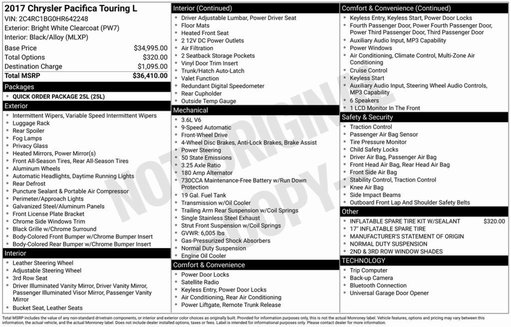 New Price! Bright White Clearcoat 2017 Chrysler Pacifica Touring L 3rd row seats: split-bench, 4-Wheel Disc Brakes, 6 Speakers, ABS brakes, Air Conditioning, Alloy wheels, AM/FM radio: SiriusXM, Automatic temperature control, Black Stow N Place Roof Rack, Brake assist, Bumpers: body-color, Compass, Driver door bin, Driver vanity mirror, Driver's Seat Mounted Armrest, Dual front impact airbags, Dual front side impact airbags, Electronic Stability Control, Front Bucket Seats, Front dual zone A/C, Front reading lights, Fully automatic headlights, Illuminated entry, Leather steering wheel, Outside temperature display, Overhead console, ParkView Rear Back-Up Camera, Passenger door bin, Power door mirrors, Power driver seat, Power Liftgate, Power steering, Power windows, Rear air conditioning, Rear window defroster, Rear window wiper, Reclining 3rd row seat, Remote keyless entry, Roof rack, Speed control, Split folding rear seat, Steering wheel mounted audio controls, Tachometer, Tilt steering wheel, Traction control, Trip computer, Variably intermittent wipers. 18/28 City/Highway MPG