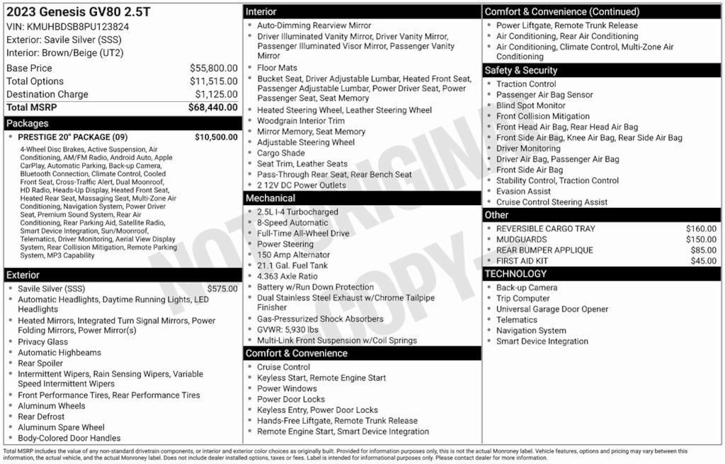 New Price! Savile Silver 2023 Genesis GV80 2.5T 12 Speakers, 3-Zone Climate Control, 4-Wheel Disc Brakes, ABS brakes, Air Conditioning, Alloy wheels, AM/FM radio: SiriusXM, Anti-whiplash front head restraints, Auto-leveling suspension, Automatic temperature control, Blind-Spot View Monitor, Dual front impact airbags, Dual front side impact airbags, Electronically Controlled Suspension, Emergency communication system: Genesis Connected Services, Exterior Parking Camera Rear, Four wheel independent suspension, Front anti-roll bar, Front dual zone A/C, Head-Up Display, Heated 2nd Row Seats, Knee airbag, Leather Seating Surfaces, Low tire pressure warning, Memory seat, Monobloc Front Brakes, Navigation System, Occupant sensing airbag, Option Group 02, Overhead airbag, Panoramic Sunroof, Parking Collision-Avoidance Assist, Power driver seat, Power Liftgate, Power steering, Power windows, Radio data system, Radio: AM/FM/SiriusXM/HD Audio System, Radio: AM/FM/SiriusXM/HD Lexicon Prem Audio System, Rain sensing wipers, Rear air conditioning, Rear anti-roll bar, Rear side impact airbag, Rear window defroster, Rear window wiper, Remote keyless entry, Remote Smart Parking Assist, Road Active Noise Control, Speed-sensing steering, Speed-Sensitive Wipers, Steering wheel memory, Steering wheel mounted audio controls, Surround View Monitor, Traction control, Variably intermittent wipers, Ventilated Front Seats, Wheels: 20 x 8.5J Medium Metallic Gray Alloy.BEST PRICE GUARANTEE Along with customer service, you will also find the best prices at College Chevrolet Buick. Our inventory has been priced to sell! Be sure to ask about our best-price guarantee* while you're here! As you can see, we're a dealership that delivers on our promise to you. We're committed to bringing you 100% customer satisfaction. We understand that buying a new car or having your current car serviced can be stressful. Get the College Experience at our Albion, Michigan dealership! *Present upon arrival. No cash value. One per customer. Must present printed copy of local competitor's printed ad published within 30 days. Only applies to same year, model, and trim. Excludes national incentives and offers. Some restrictions may apply. See dealer for complete details.